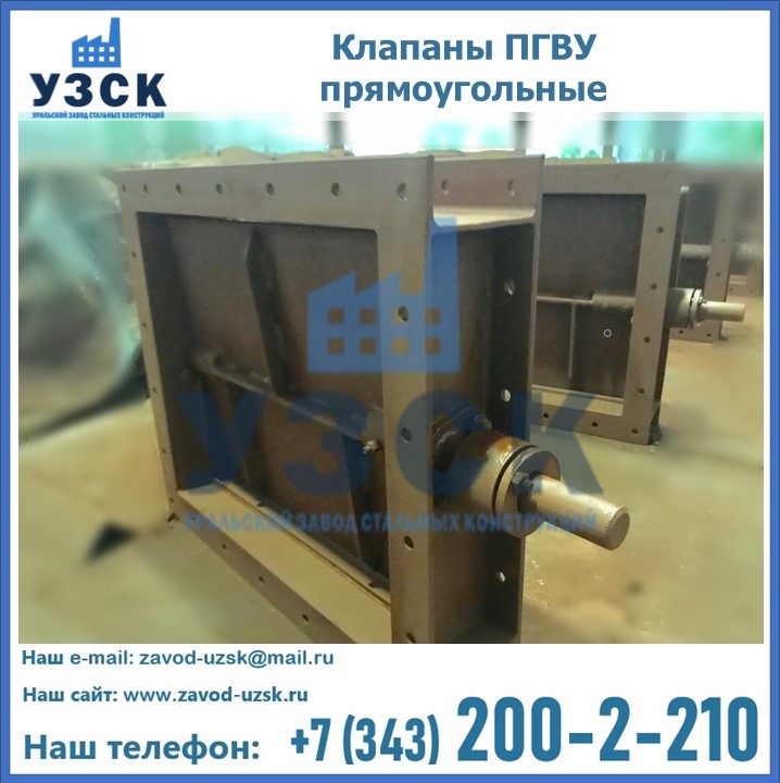 Прямоугольный клапан ПГВУ имеет прямоугольную или квадратную форму, по основному сечению конструкции, на которую устанавливается клапан. Для изготовления в Атырау применяются сталь или чугун, в зависимости от модели. Внутри клапана имеется запорный элемент, передвигающийся параллельно общему потоку движения среды. Шибер ПГВУ имеет такую же форму, как и основное сечение. Перемещение створки происходит благодаря возвратно-поступательным движениям.