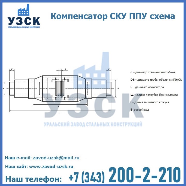 Уральский Завод Стальных Конструкций в Атырау предлагает готовые изделия, а также вы можете приобрести компенсатор СКУ ППУ под заказ. Наш завод располагает всем необходимым оборудованием для производства нестандартных позиций компенсатора СКУ в ППУ изоляции. Завод «УЗСК» предлагает большой выбор качественных и надежных компенсаторов СКУ ППУ, полностью укомплектованных и готовых к эксплуатации. Мы гарантируем соответствие нашей продукции всем требованиям ГОСТ и ТУ, износостойкость и высокую производительность. Наше предприятие поставляет и производит оборудование, имеющее длительную гарантию и большой эксплуатационный ресурс. Если вы хотите заказать сильфонные компенсационные устройства СКУ ППУ или другое оборудование с доставкой, наши специалисты помогут рассчитать стоимость транспортных расходов и организуют доставку товара. Вы можете оформить заказ на продукцию на нашем сайте, для этого достаточно заполнить форму обратной связи.