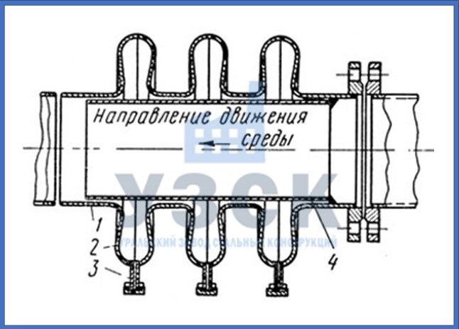 Каждый компенсатор представляет линзу, сваренную из двух половин тонкостенной конструкции способной принять 8 мм расширения или сжатия. В зависимости от расчетов, для приема изменения длины трубы устанавливают конструкцию из 1-4 компенсаторов. Они называются осевыми.