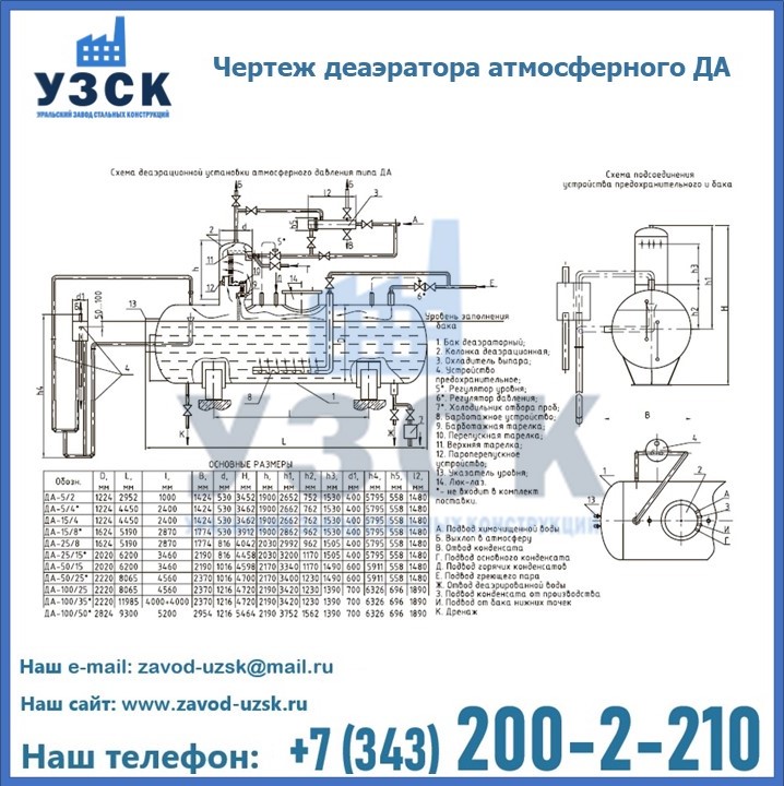 Приобрести качественное оборудование, в том числе, деаэраторы ДА, можно в компании УЗСК в Атырау. Мы предлагаем долговечную и надежную продукцию по приемлемой цене. Заказать и купить деаэраторы или другие изделия высокого качества можно через сайт Уральского Завода Стальных Конструкций, или позвонив по указанному в разделе «Контакты» телефону.